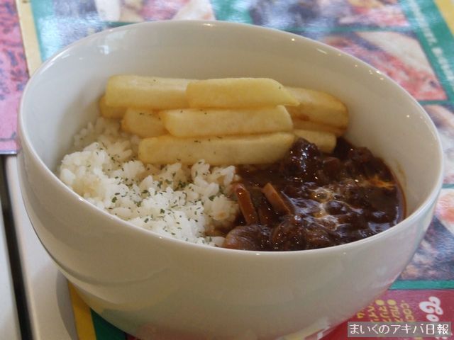 早い話が、ビーフシチューをかけた丼で、フライドポテトが添えられている。