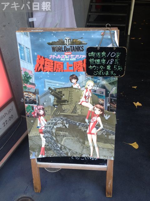 Cafe Mai:lishで、WORLD of TANKSコラボイベントが開催されているようで、店頭の立て黒板にこんなポスターが貼られていました。