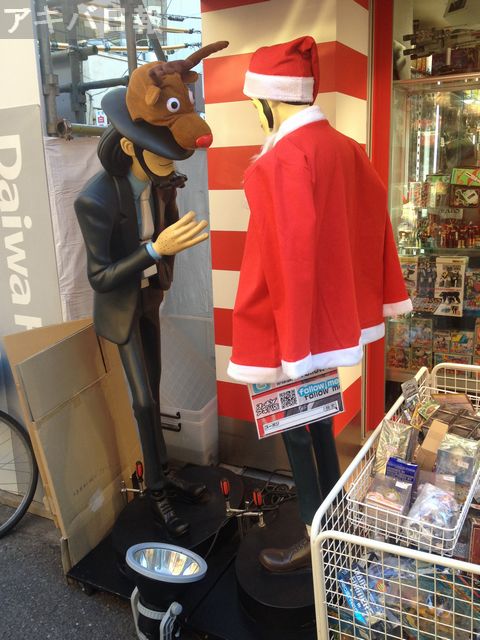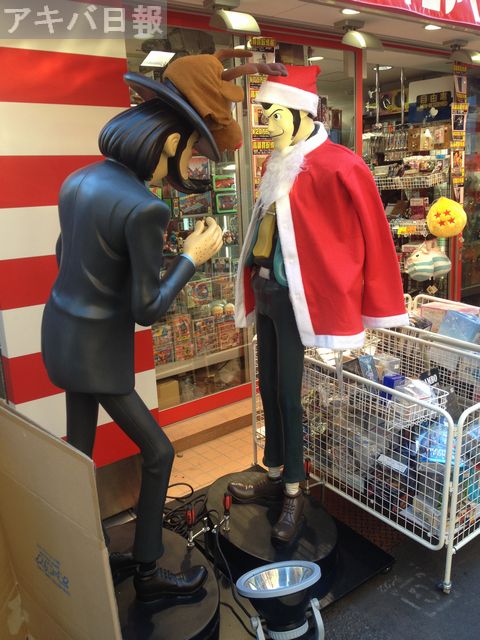 スーポジ店頭に置かれたルパンフィギュアと次元フィギュアがサンタとトナカイのコスプレ(?)をしていました。