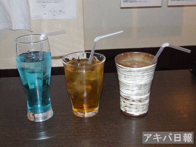左から「ウホッ!いい男(ブルーサイダー)」、「腹ン中がパンパンだぜ(アイス緑茶)」、「こんどは俺の番だろ?(アイスカフェオレ)」。
