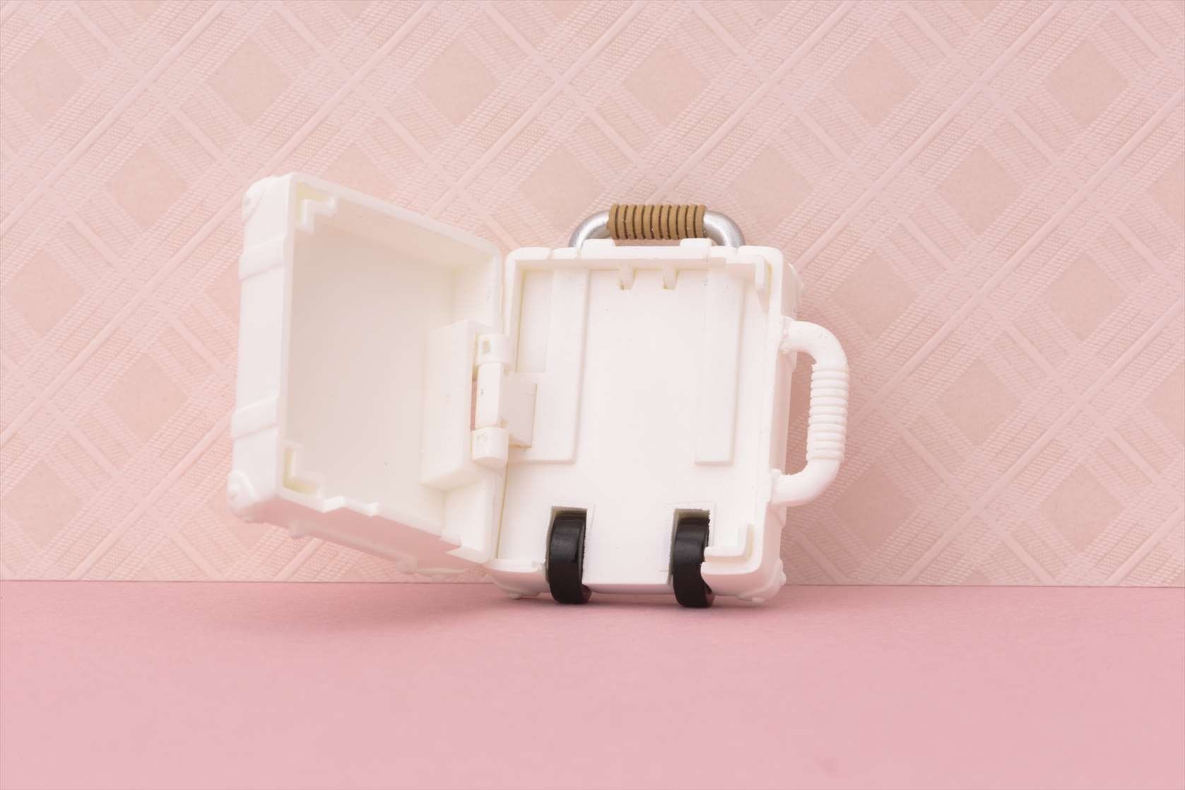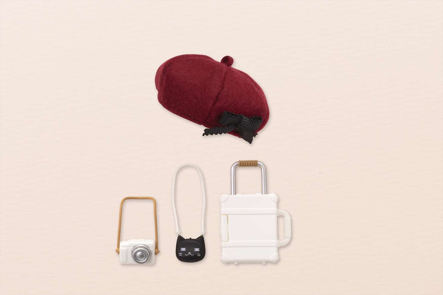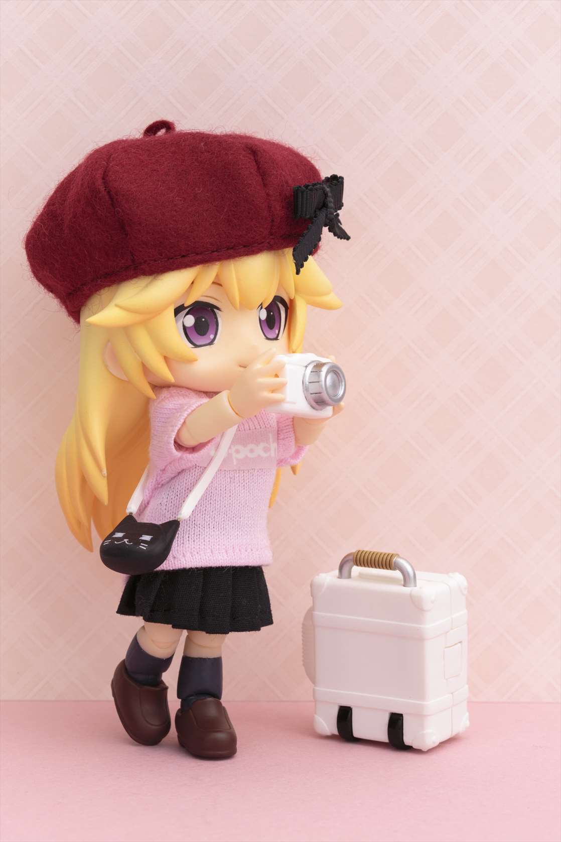 小さいサイズながらもに収納部の開閉とハンドルの伸縮ギミックを搭載した「キャリーケース」に、猫をモチーフにしたキュートな「ポーチ」、ストラップが着脱可能な「カメラ」と、リボンのついた「ベレー帽」のセットになります。「カメラ」をキャラクターに持たせる為の手首も付属します。通常販売品の「ベビーピンク」「ペールアクア」の2色に加え、「ミルキーホワイト」はコトブキヤショップ(秋葉原館、大阪日本橋、オンラインショップ)限定商品として同時発売です。