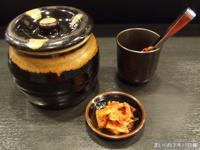 少し酸味がある、結構辛めのキムチが壷に入っている。キムチは食べ放題なので、取り皿に取って好きなだけ食べられる。1kgくらいなら1日で食べ尽くすほどキムチ好きなおいらには凄く嬉しいサービス。