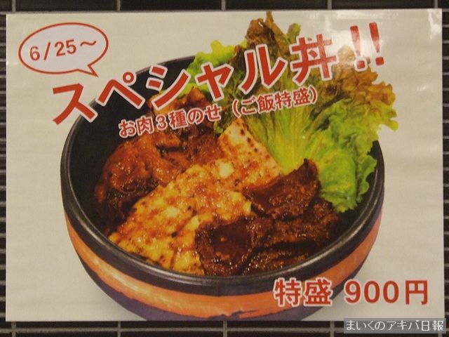 この「スペシャル丼」は、カルビ・ハラミ・豚ロースの3種肉が乗っている、ご飯が特盛の丼で、並・大盛は無い。価格は¥900。